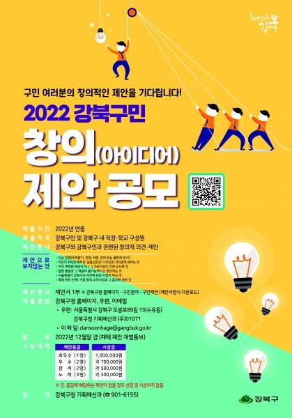 박겸수 강북구청장은 “구민과 직원의 참신하고 다양한 의견이 행복한 강북구로 가는 밑거름이 될 것으로 본다”며 “구정에 대한 관심과 애정을 바탕으로 제안 공모에 많은 참여를 바란다“라고 말했다.