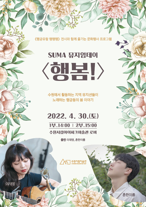 ‘SUMA 뮤지엄데이 : 행봄’은 ‘수원지역 뮤지션이 노래하는 행궁동의 행복한 봄 이야기’를 주제로 한 어쿠스틱 포크 장르 공연으로 미술관 현장과 인스타그램 라이브 생중계를 통해 관람할 수 있다.