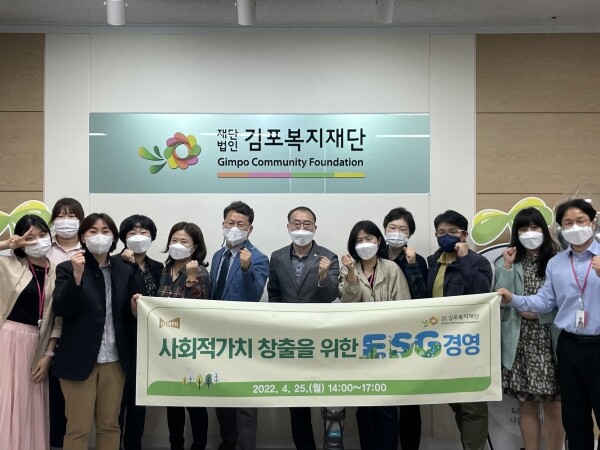 김포복지재단은 ESG 경영실천 이해를 통한 지역밀착형 사회구조를 만들고 현재 실시하고 있는 사회복지서비스의 질적 향상을 위해 기반을 만들기 위해 선도적 복지체계를 마련하기 위한 다각적인 노력을 실시하고 있으며이와관련해 지구의날 행사 ‘소등행사’ 참여와 ESG 실천, 탄소중립의 필요성 공감대 형성과 생활실천을 확산하고자 기후변화주간 관내 사회복지시설기관 및 단체, 기업, 사회, 시민단체 소속기관의 일원이 함께 동참하는 ‘김포시 사회복지시설 기관 및 단체와 함께하는 기후변화에 따른 ESG 캠페인’ 참여를 실시하고 있다.
