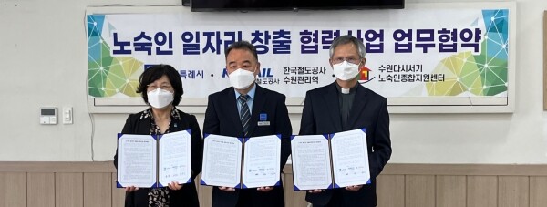 이날 협약식에는 박미숙 수원시 복지여성국장, 석진산 수원관리역장, 강관석 수원다시서기노숙인종합지원센터장이 참석했다.