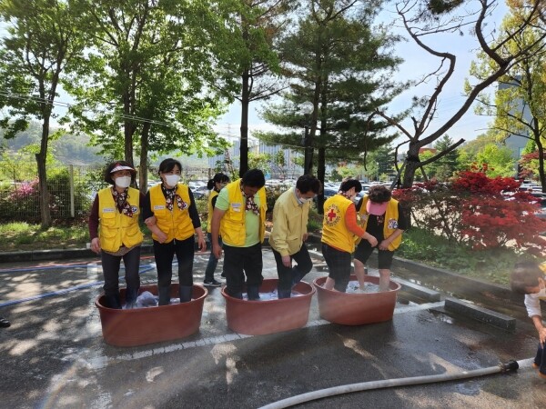 이날 시흥연성장곡봉사회는 고령과 세탁시설 부족으로 이불빨래가 어려운 독거어르신 등을 위해 총 15가구, 18채의 이불을 직접 수거하고 12여명의 참여 회원들이 이불을 직접 발로 밟아 애벌빨래한 후, 이동세탁 차량을 이용해 세탁을 마쳤다.