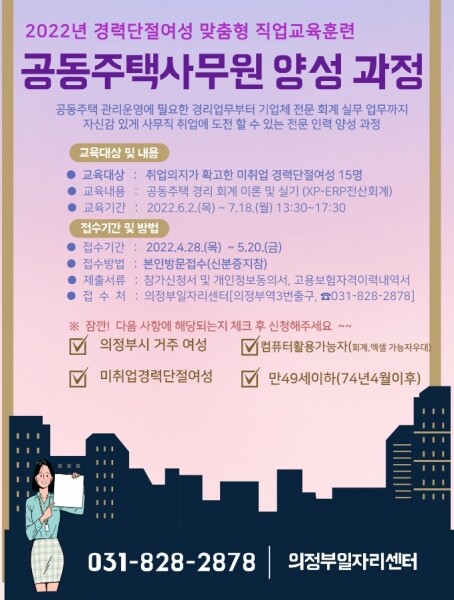 참여 대상은 컴퓨터 활용이 가능하며 사무 직무로 취업을 희망하는 의정부시에 주소를 둔 만 49세 이하의 구직희망 여성으로 선발된 교육대상자는 교육 수료 후 교육비 전액 환급과 참여수당을 지원받을 뿐만 아니라 지속적인 상담과 취업 알선 등 취업 관련 서비스를 제공받게 된다.