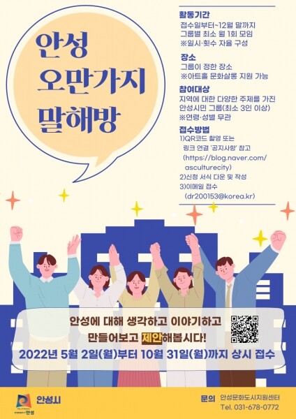 특히 ‘오만가지말해방’을 통해 나온 시민의 의견, 희망사항 등은 향후 진행될 ‘안성문화시민 리빙랩사업’, ‘워킹그룹’ 등을 통해 시민이 직접 실행해볼 수 있는 기회로 연결될 예정이다.