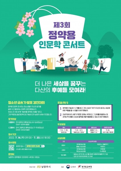 참가 접수 및 에세이 제출은 오는 7월 14일부터 20일까지 ‘정약용 인문학 콘서트’ 공식 누리집에서 온라인으로 가능하며 심사는 중등부와 고등부로 부문을 나눠 서류 심사와 발표 심사로 이뤄진다.
