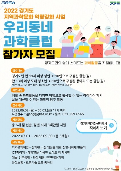 이 사업은 과학기술정보통신부에서 지역과학문화 생태계 구축을 위해 추진하는 ‘지역과학문화 역량강화 사업’의 하나로 경기도는 도내 과학 동아리 6개 팀을 선발할 계획이라고 전했다.