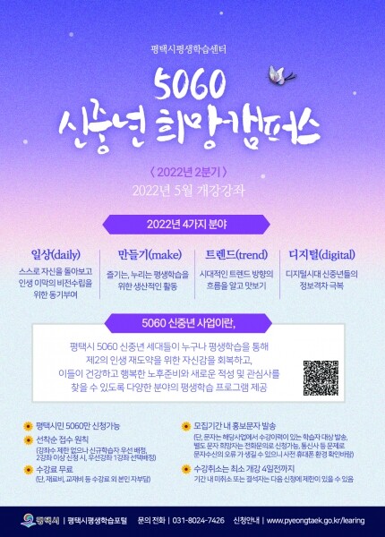 5060 신중년 교육 프로그램은 평택시 50대~60대 신중년들의 건강하고 행복한 노후준비의 시작과 새로운 적성 및 관심사를 찾을 수 있도록 다양한 분야의 평생학습 프로그램의 기회를 제공하고 있다.