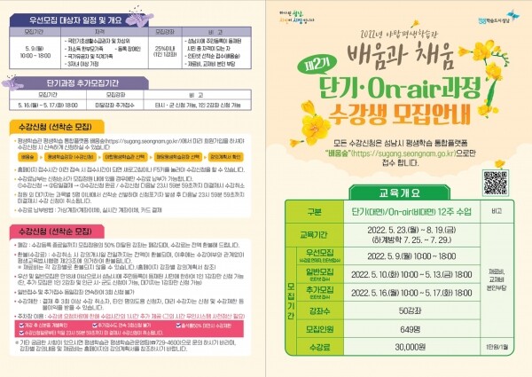 배움과 채움 과정을 수강하려는 18세 이상의 성남시민은 기간 내 성남시 평생학습 통합플랫폼 ‘배움숲’을 접속해 선착순 신청하면 된다.