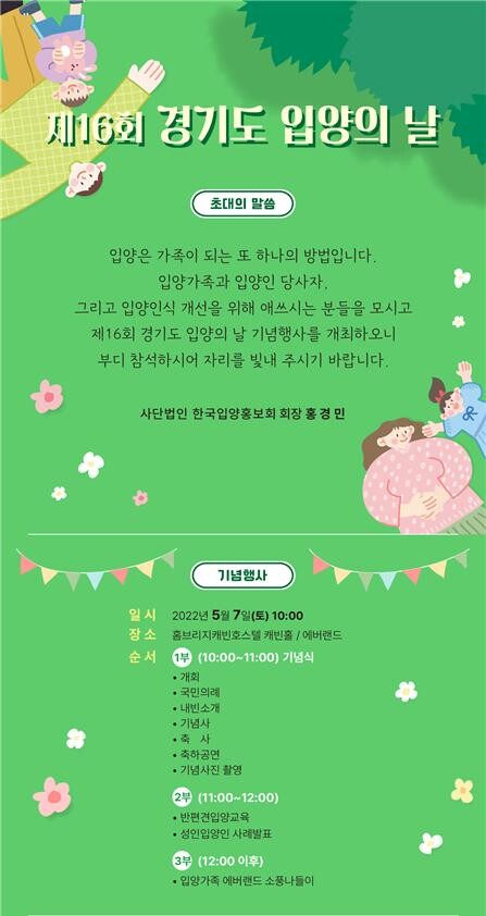 지주연 경기도 여성가족국장은 “가정의 달 5월을 맞아 입양가족의 정체성을 고취하며 화합과 단결을 도모할 수 있는 기념행사를 마련했다”며 “앞으로 국내 입양사업 활성화를 위해 노력하겠다”고 말했다.
