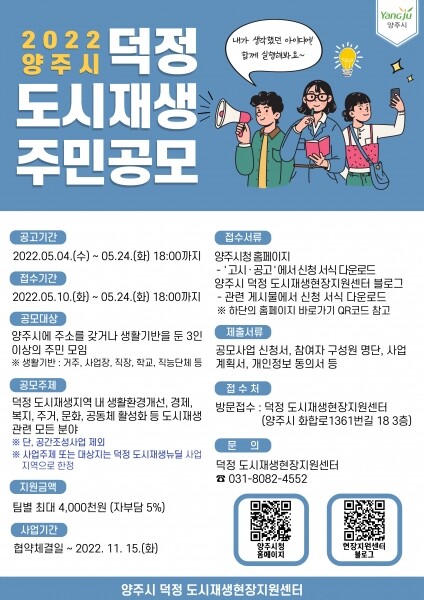 공모 신청은 양주시 홈페이지와 덕정 도시재생현장지원센터 블로그에서 신청 서식을 내려받아 지원센터로 방문 제출하면 된다.