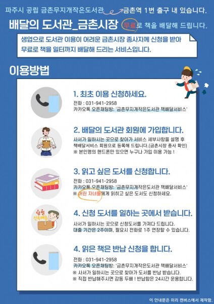 전화나 SNS 등을 통해 도서를 신청하면 담당 사서가 직접 방문해 제공 및 회수하는 서비스로 자세한 사항은 금촌무지개작은도서관으로 문의하면 된다.