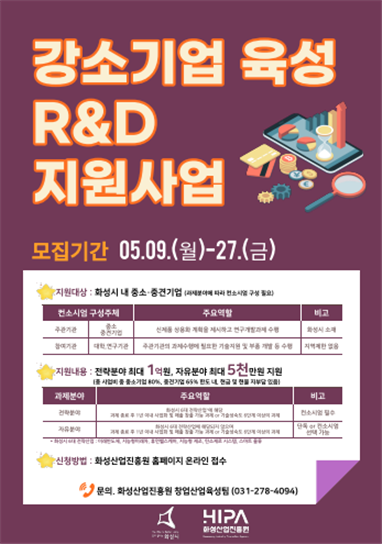 [뉴스써치] 화성산업진흥원이 ‘강소기업 육성 R&D 지원사업’에 참여할 화성시 소재 중견·중소기업을 오는 27일까지 모집한다.