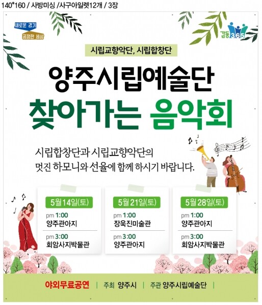 시립예술단은 5월 14일 5월 28일 오후 3시 양주시립 회암사지박물관, 5월 21일 오후 1시에 양주시립 장욱진 미술관, 5월 14일 5월 28일 오후 1시와 5월 21일 오후 3시 양주관아지에 설치된 야외무대에서 시민들의 눈높이에 맞춘 친숙한 공연을 펼칠 예정이다.