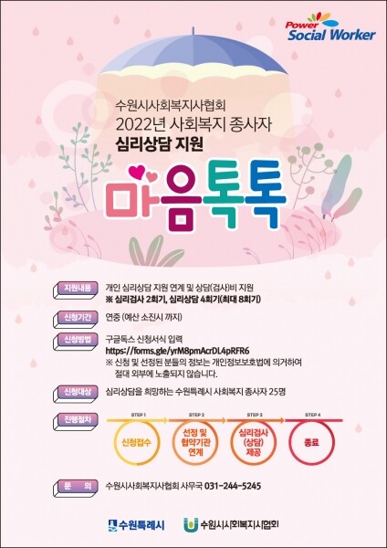 수원시사회복지사협회가 주관하는 이번 사업은 클라이언트의 폭력, 직장 내 괴롭힘 등으로 심리적 외상을 겪은 사회복지 관련 기관 종사자의 정신건강 회복을 위해 심리상담 등을 지원하는 것이다.