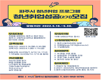 모집대상은 만19~39세 취업을 희망하는 파주시 청년 또는 파주시 관내 소재 고등학교 및 대학교 졸업예정자 이며 교육은 6월 7일부터 7월 15일까지 온라인으로 진행된다.