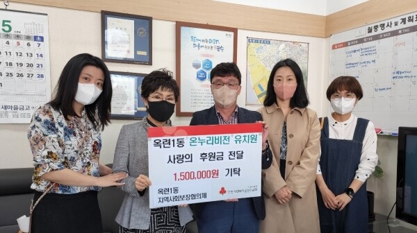 원상희 옥련1동 지역사회보장협의체 공공위원장은 “매년 지속적으로 온정을 나눠주시는 온누리비전유치원에 진심으로 감사드리며 기부해주신 후원금은 코로나19로 힘든 시기를 보내고 있는 취약계층의 복지증진을 위해 소중히 사용하겠다”고 말했다.