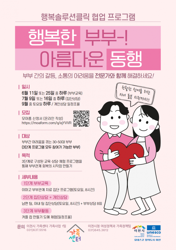부부교육, 집단상담, 부부 활동의 3단계 프로그램과 8회기의 개인 상담을 모두 참여할 수 있는 이천시민이라면 누구나 참여 가능하며 신청 접수는 다음 달 10일까지 온라인 신청서를 제출하거나 이천시청 여성정책과 가족정책팀 또는 이천시 가족센터 가족사업 1팀으로 문의하면 된다.
