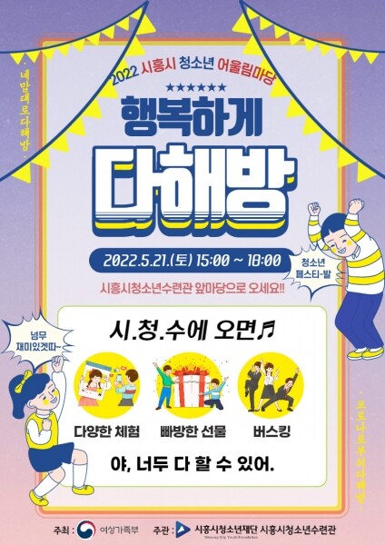 ‘행복하게 다해방’이라는 주제로 열리는 이번 청소년어울림마당은 코로나19로 인해 비대면으로 열렸던 지난해와는 다르게 대면으로 시민들을 만나며 그간 코로나로 지친 청소년과 지역주민들에게 행복과 힐링을 선사할 예정이다.