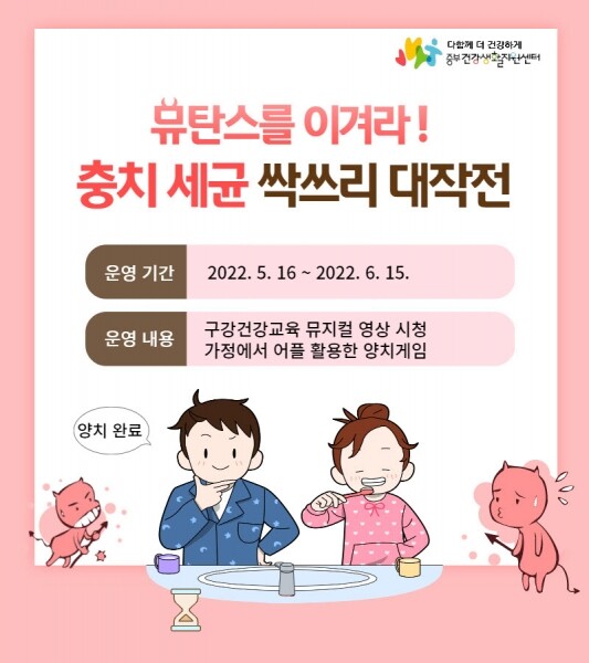 중부건강생활지원센터 관계자는 “구강관리에서 가장 중요한 것은 매일 실천해야 하는 ‘올바른 칫솔질’이며 중부권 지역주민이 건강한 치아를 가질 수 있도록 돕는 데 힘을 쏟겠다”고 전했다.