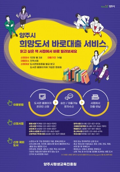조명희 양주시 평생교육진흥원장은 “새롭게 시작하는 희망도서 바로대출 서비스가 지역서점의 상생뿐만 아니라 지역주민들의 편리한 도서이용 환경에 일조할 것으로 기대한다”고 말했다.
