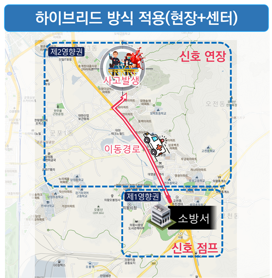 특히 의왕시에서 구축하는 긴급차량 우선신호 시스템은 전국 최초로 현장제어방식과 센터제어방식을 혼합한 하이브리드 방식을 적용해 현장제어방식의 신속성과 센터제어 방식의 효율성을 모두 갖추면서 비용도 크게 절감 될 수 있도록 구축된다.