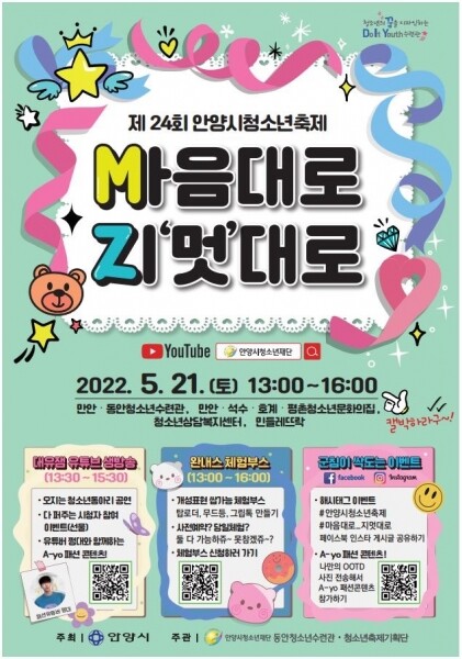 MZ세대들의 끼와 멋을 주제로 온라인 유튜브 생방송과 안양시청소년재단 각 시설에서 진행되는 거점형 체험부스로 진행된다.