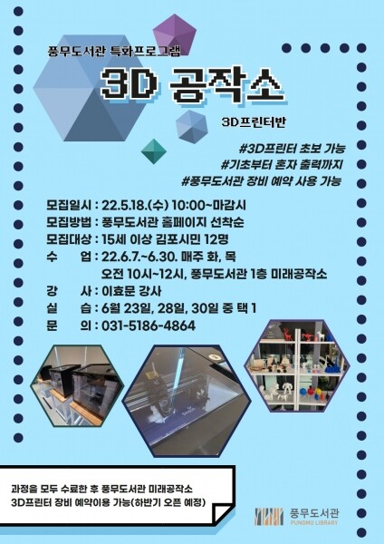 이번 강의는 6월 7일부터 30일까지 매주 화요일 목요일 오전 10시에 풍무도서관 1층 미래공작소에서 진행된다.