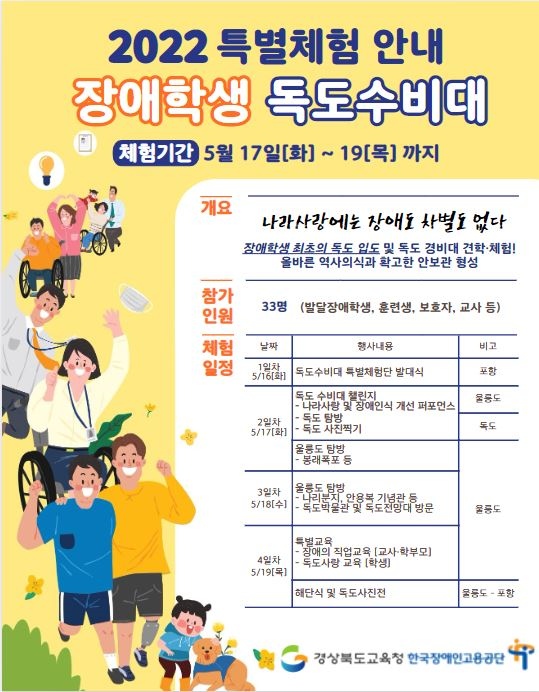 장애인 학생 및 훈련생, 학부모, 특수교사 등 33명으로 구성된 이번 특별체험단은 독도 방문을 통해 독도 사랑 및 장애인식개선 퍼포먼스, 동도에 있는 독도 망양대 탐방 등의 독도수호챌린지를 진행하고 ‘나라 사랑에는 장애나 차별이 없다’는 우리 땅 독도와 장애인식에 대한 메시지를 전할 계획이라고 전했다.