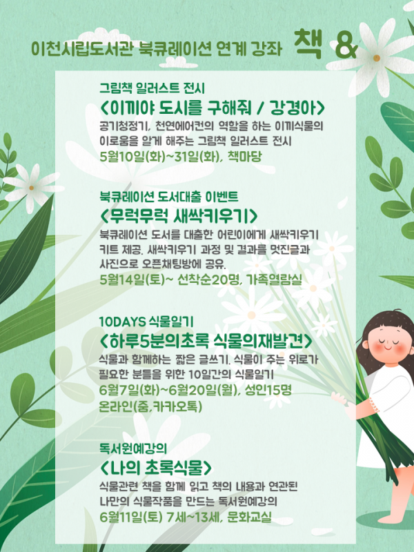 5,6월에는 북큐레이션 주제인 식물과 연계한 프로그램으로 그림책 일러스트 전시‘이끼야 도시를 구해줘’, 도서대출이벤트 ‘무럭무럭 새싹키우기’, 10DAYS 식물일기‘하루5분의 초록’, 독서원예강의 ‘나의 초록식물’ 등을 진행한다.