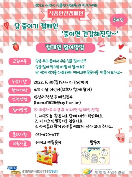 만안청소년수련관 박영미 관장은 “당 줄이기 캠페인은 우리 아이들의 건강한 식습관을 형성하기 위해 준비한 프로그램으로 당 섭취에 대한 올바른 이해와 건강증진에 도움이 되길 기대한다”고 밝혔다.