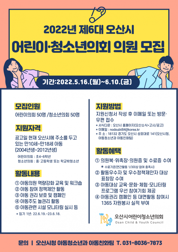신청 자격은 공고일 현재 오산시에 주민등록이 되어 있는 만10세 ~ 만18세 (2012년생~2004년생) 아동으로 어린이의회 의원은 초등학교 4학년 ~ 6학년, 청소년 의회 의원은 중·고등학교 및 학교 밖 청소년 등 누구나 신청이 가능하다.