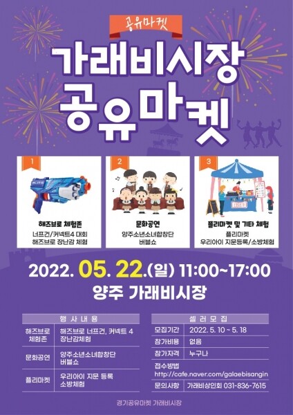 김형용 가리배중앙로상점가 상인회장은 “작년에 개최한 경기공유마켓사업 경험을 토대로 이번에도 다양한 공연과 체험프로그램을 기획해 참여자들과 주민들뿐만 아니라 많은 사람에게 역사와 전통을 가진 가래비 상권을 알릴 수 있는 계기가 되었으면 좋겠다”고 말했다.