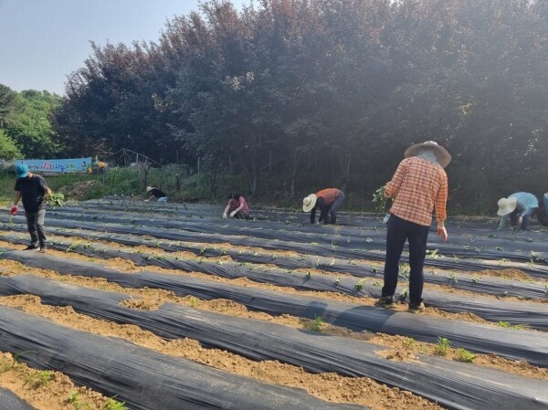 15일 사랑의 나눔 텃밭에 주민자치회 위원들이 참석해, 지난 4월부터 주민자치회 위원들이 고르고 고랑을 만들어 놓은 밭에 고구마 모종을 심었다.