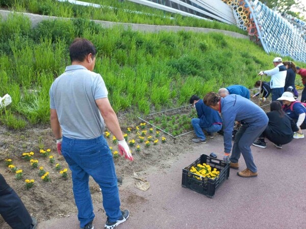 마을공동체분과 소속 위원과 주민자치회 위원 30여명이 이른 아침부터 참여했고 150미터 정도 길이의 화단에 구절초와 메리골드 3000본을 식재했다.