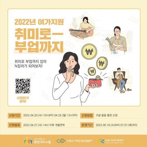 18일 시작된 ‘2022 여가지원-취미로 부업까지’는 수원에서 거주하거나 활동하는 만19~34세 청년이 여가·취미 프로그램에 참여하면서 문화생활을 즐기고 부업으로 발전시켜 수익 창출까지 할 수 있도록 지원하는 것이다.