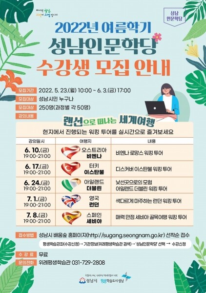 수강 신청하려면 오는 5월 23일부터 6월 3일까지 성남시 평생학습 포털 배움숲을 통해 선착순 접수하면 된다.