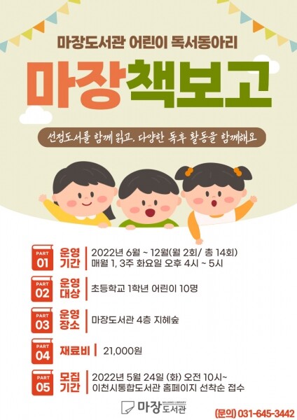 참여자 모집은 5월 24일부터 시작되며 자세한 내용은 이천시통합도서관 홈페이지를 확인하거나, 마장도서관 담당자에게 문의하면 된다.