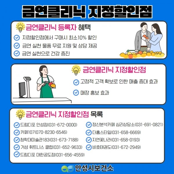 지정할인점이 될 경우 안성시의 금연 환경 조성에 기여할 수 있을 뿐만 아니라 금연클리닉 등록자 수백여명을 고정적인 고객으로 확보할 수 있다.