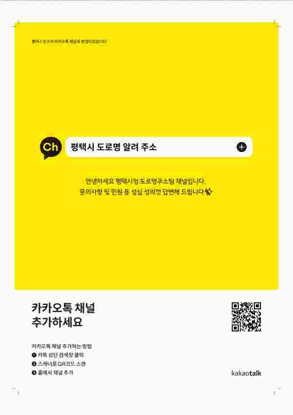 신청방법은 평택시청 토지정보과 도로명주소팀으로 전화 신청 및 카카오톡에서 ‘평택시 도로명 알려 주소’를 채널 추가해 카카오톡으로 신청하면 된다.