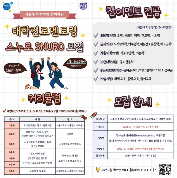 오는 7월 9일부터 8월 27일까지 매주 토요일 13~오후 4시 총 7회 차로 운영되는 ‘스누로’는 서울대학교 시흥캠퍼스 또는 비대면으로 열리며 진로 포트폴리오 제작, 전공 박람회, 서울대 관악캠퍼스 투어 등 다양한 활동이 준비돼 있다.