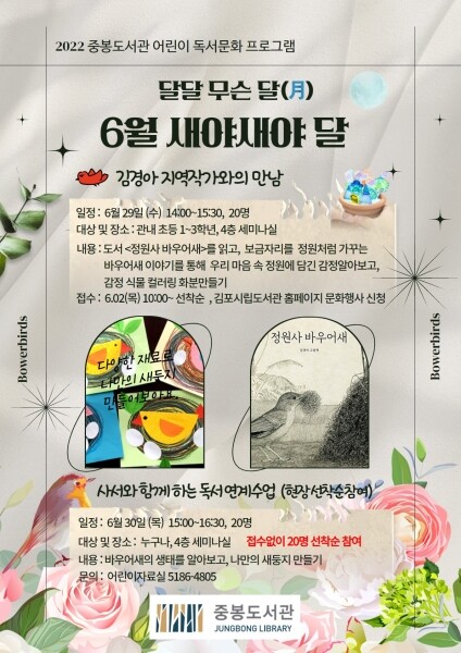 오는 6월 29일부터 30일까지 수요일 오후 오후 2시, 목요일 오후 오후 3시부터 1시간 30분 동안 ‘달달 무슨 달-6월 새야새야달’을 중봉도서관 4층 세미나실에서 진행한다.