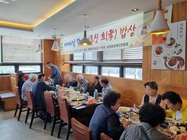 이번 행사는 평소 마을의 발전을 위해 모범이 되어 주신 어르신들에게 존경과 감사의 마음을 전하기 위해 마련됐으며 이찬호 회장을 비롯해 남기태 송정동장, 이상옥 송정동 통장협의회장, ㈜일신산업전기 고수영 대표, 성일측량설계공사 문병훈 대표, 성심의료재단 유미하 대표, ㈜마루건축사 김혜경 대표, 김용원 부일측량설계공사 대표, 이효영 삼광골프연습장 대표가 함께 참석했다.