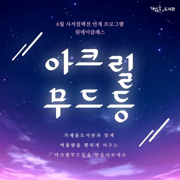 이번 가재울도서관 6월 사서컬렉션 연계프로그램은 여름밤을 환하게 비추는 아크릴 무드등 만들기를 통해 여름의 계절감을 느낄 수 있는 동시에 만들기의 즐거움을 느낄 수 있는 수업이 될 것이다.