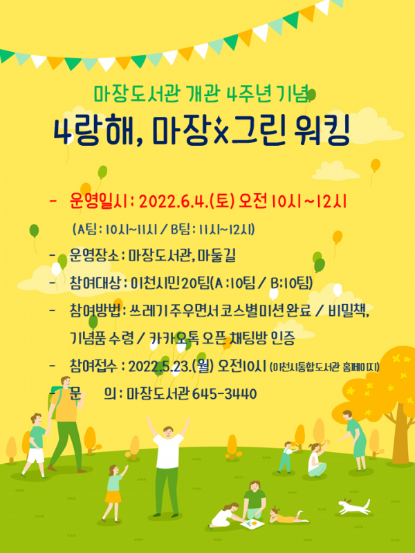 도서관 관계자는 “‘4랑해, 마장 그린 워킹’ 환경 캠페인을 통해 우리 마을에 대한 애착심을 기르고 도서관의 잠재적 이용자를 확보하면서 지역문화 공동체가 활성화 될 수 있기를 바란다”고 말했다.
