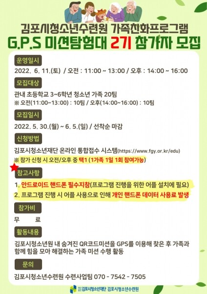 G.P.S 미션탐험대 프로그램은 가족이 한 팀이 되어 지도와 나침반 대신 스마트폰의 위치기반기술을 활용해 수련원 내 숨겨진 미션장소에 찾아가 다양한 단체미션과 돌발퀴즈를 해결하는 가족협력프로그램이다.