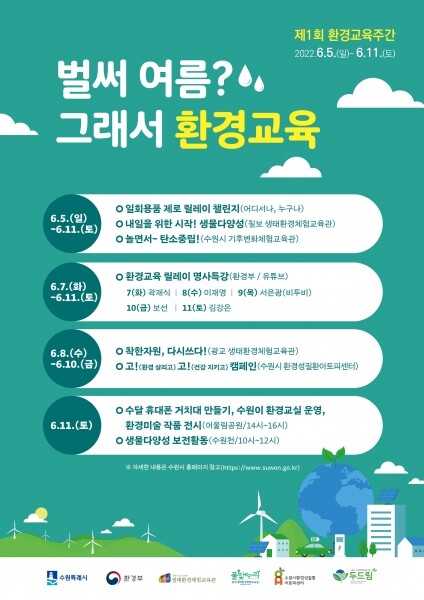 수원시 관계자는 “환경교육주간 행사를 계기로 단순히 ‘배우는 환경교육’이 아닌 실천으로 이어지는 환경교육이 활성화되길 바란다”고 말했다.