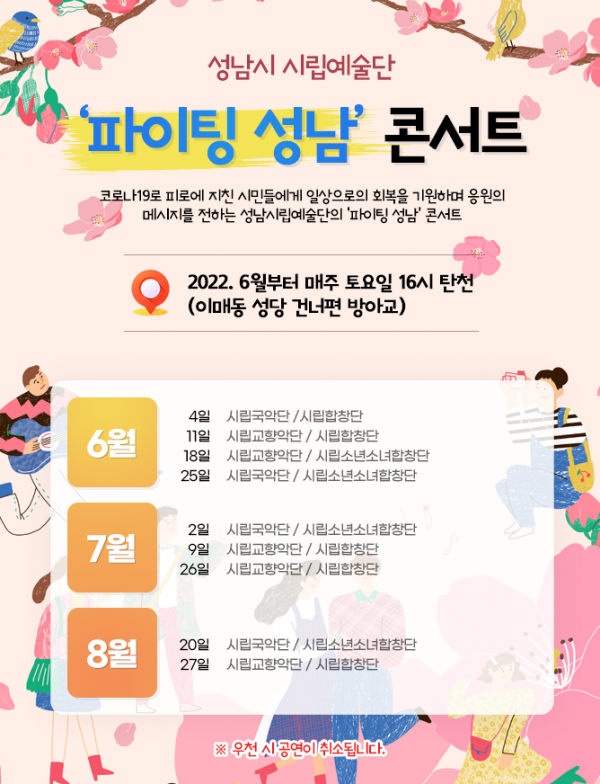 6월 4일부터 성남시립국악단과 합창단의 공연을 시작으로 매주 토요일 오후 4시부터 1시간 동안 이매동 성당 맞은편 탄천 방아교 아래에서 시립예술단이 다양한 연주와 합창을 선보일 예정이다.