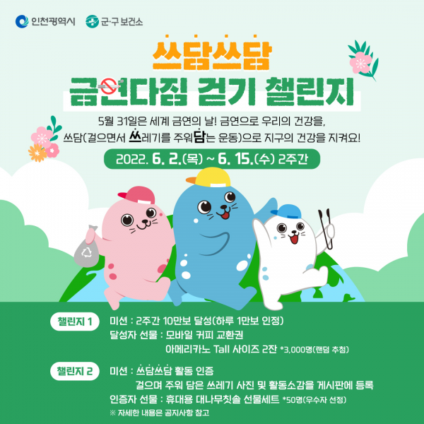 인천시는 담배가 환경에 미치는 영향과 금연의 중요성을 홍보하고자 모바일 걷기 앱 워크온 챌린지 운영과 금연홍보 활동을 실시하기로 했다.