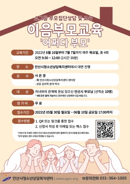 신청은 자녀 양육과 관계 개선에 관심이 있는 부모라면 누구나 무료로 신청 가능하며 다음달 10일까지 안산시청소년상담복지센터 누리집을 통해 선착순 10명을 모집한다.
