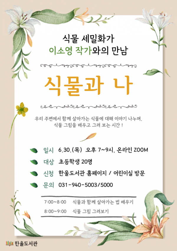 이현주 교하도서관장은 “어린이들이 일상생활 속 식물들을 새롭게 발견하고 친밀한 관계를 맺으며 자연의 소중함을 생각해 볼 수 있는 시간이 되길 바란다”고 말했다.