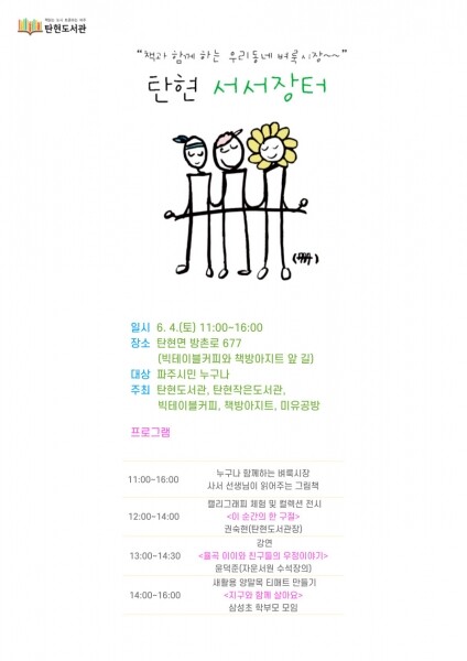 또한, 12시부터 오후 2시까지 탄현도서관의 북큐레이션 ‘이웃의 발견’이 전시되며 11시부터 오후 4시까지 탄현도서관 사서가 그림책을 읽어주는 시간도 마련되어 있다.